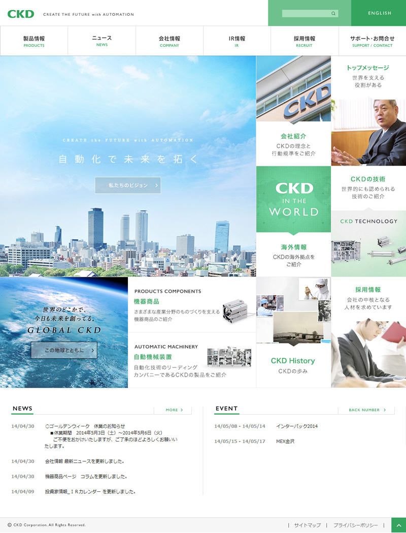 這是一家日本商業(yè)機(jī)械網(wǎng)頁設(shè)計(jì),采用logo綠色,并在底部設(shè)置返回頭部的按鈕,是一個(gè)非常好用戶體驗(yàn)的設(shè)計(jì)。