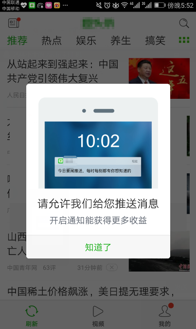 到達(dá)率很關(guān)鍵,如果你選取的推送工具沒有保障,或者就是達(dá)到率不高的話,就欲哭無淚了。比如之前我們家產(chǎn)品股事匯用的第三方工具,那個達(dá)到率可謂是讓人想砸掉后臺啊,到達(dá)率不到三分一,特別是安卓,因為安卓的多樣性(各個安卓手機(jī)大佬們能不能組成一個安卓聯(lián)盟啊)那個成功率低的可憐,而有些手機(jī)是自動屏蔽掉信息的推送的,所以到達(dá)率就更加低了。ios可能還好點(diǎn),現(xiàn)在很多app在打開后都會自動友好提醒用戶打開消息推送,比如下圖。所以這個達(dá)到率問題,只有兩個解決辦法,要不然就是換個貴一點(diǎn)的,可能會好點(diǎn),要不然自己開發(fā)后臺,但是成功是個問題,能不能說服你家boss就靠你的忽悠了。