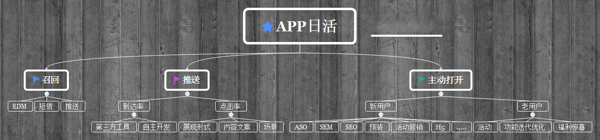 好了,上面是基于一個用戶的日活,然后羅列出影響日活的一些因素,但最這些因素進(jìn)行細(xì)分,最后各個擊破,這就有一個清晰的邏輯順序,什么時候做什么,以及要做哪些事情都會比較清楚。做產(chǎn)品運(yùn)營或者app推廣,就怕就是一團(tuán)糟,就是腦子的思維線索就是一捆線,哪個是線頭都找不到,那就麻煩了。
