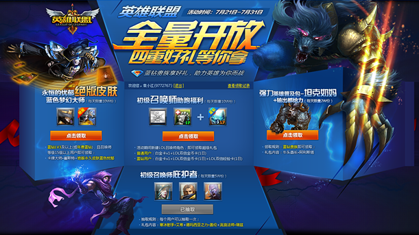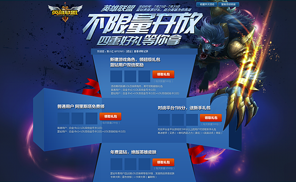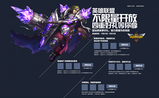 通常領(lǐng)取禮包的活動(dòng)頁(yè)面,都會(huì)運(yùn)用到游戲相關(guān)人物、標(biāo)題、禮包、LOGO等素材,一般我們會(huì)簡(jiǎn)單的將頁(yè)面的信息做好布局。在這個(gè)階段中,我們已經(jīng)給頁(yè)面基本的方向做了定位,當(dāng)然是需要和產(chǎn)品同事一起討論確認(rèn)的。接著就是增加視覺(jué)細(xì)節(jié)和禮包內(nèi)容,并完成最終的設(shè)計(jì)稿。但是,我們有沒(méi)有花一點(diǎn)時(shí)間去思考一下,活動(dòng)頁(yè)面的關(guān)鍵詞“四重好禮”。是否有其他更為貼切的設(shè)計(jì)方式呢?經(jīng)過(guò)一番思考,我們可以探索性的去嘗試,將禮包放在盒子里的設(shè)計(jì)思路。