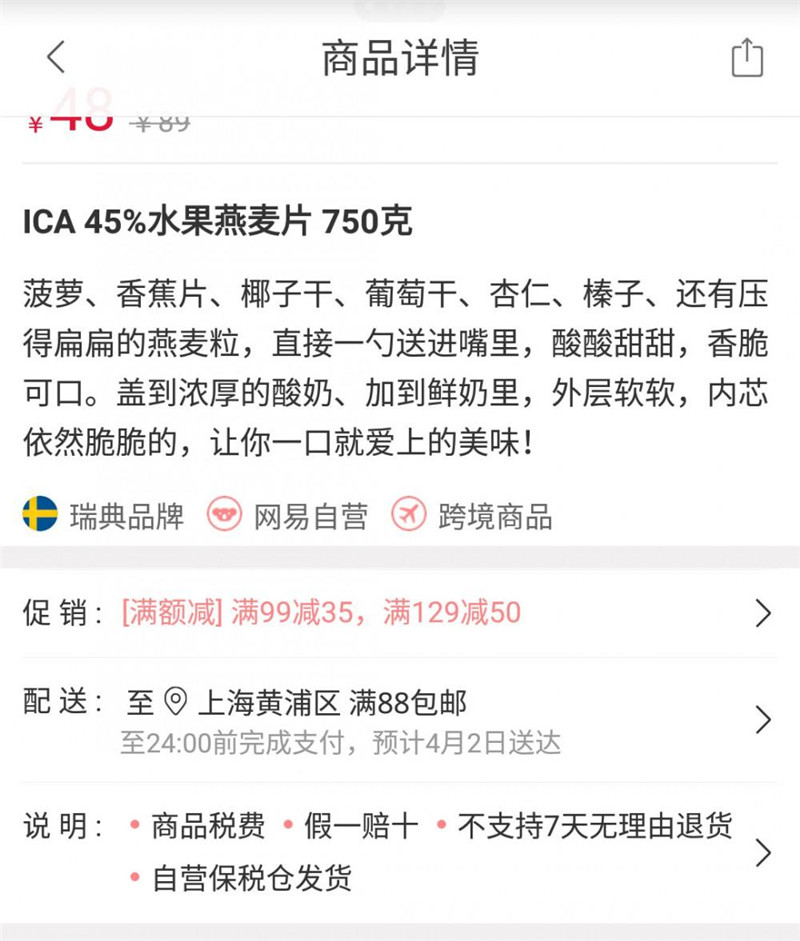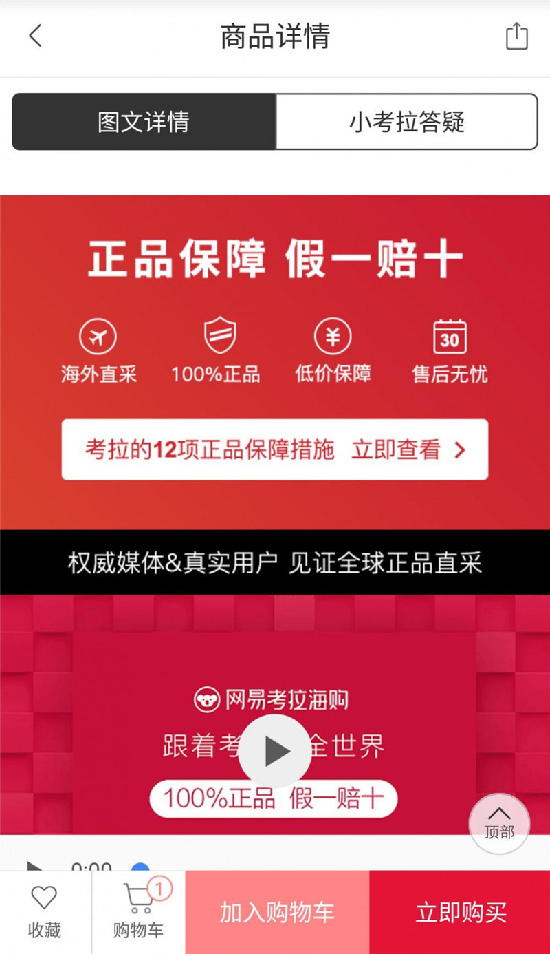 比如網(wǎng)易考拉,它在商品詳情頁的底部會(huì)用一整屏的內(nèi)容來凸顯他們對(duì)用戶的承諾:正品保障,假一賠十。非常的簡單粗暴,但又讓人信服。