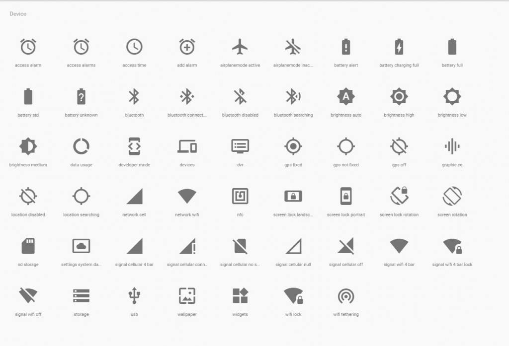 在現(xiàn)代的數(shù)字設(shè)計(jì)當(dāng)中,字符圖標(biāo)在古老的字符系統(tǒng)上有了新的發(fā)展。現(xiàn)在的字符圖標(biāo)同樣包含了字母、數(shù)字和圖形,它們中所涵蓋的內(nèi)容更加豐富。這樣一來,現(xiàn)在提及字符圖標(biāo),我們通常不會(huì)將它們視為文字,而是圖標(biāo)。下面是Material Design 的字符圖標(biāo)集: