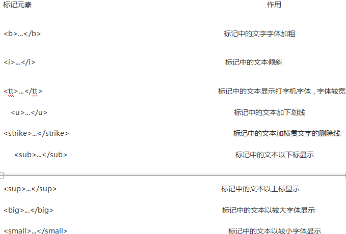 1)物理類型的標(biāo)記元素:這類標(biāo)記元素用于設(shè)置文本在網(wǎng)頁(yè)中顯示時(shí)的格式,告訴瀏覽器應(yīng)該以何種格式顯示文字,常用物理類的標(biāo)記元素及其作用如下圖。