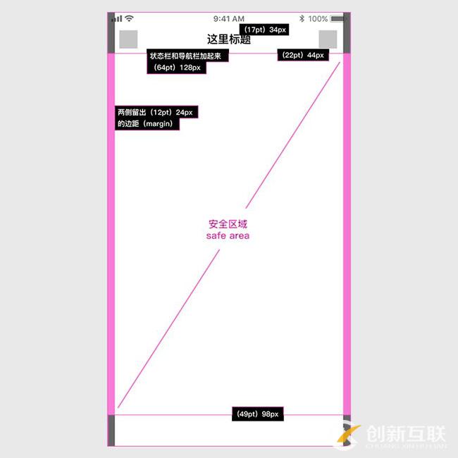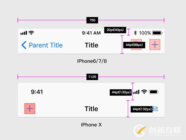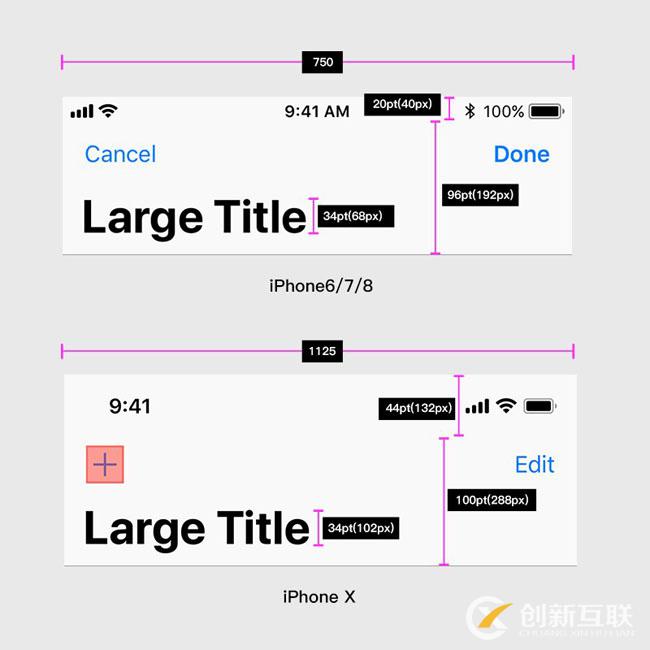 b、iPhone設(shè)計(jì)需注意到的尺寸設(shè)計(jì),包含導(dǎo)航欄設(shè)計(jì)、大標(biāo)題導(dǎo)航欄設(shè)計(jì)、tab欄設(shè)計(jì)等。大標(biāo)題導(dǎo)航欄的高度一般為116pt(包含20pt狀態(tài)欄,返回圖標(biāo)信息,大標(biāo)題34pt)。滑動頁面時大標(biāo)題會變成正常導(dǎo)航欄的64pt。