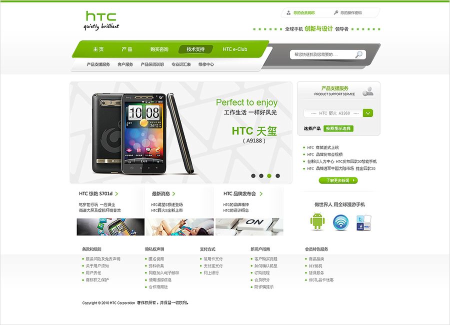 Banner下方的分欄信息部分,我們分別放置了手機(jī)配件、HTC如影攝像頭、免費(fèi)更換服務(wù)三個信息欄目,為了讓分欄信息的排版不過于單調(diào),我們將本來的四欄布局更改為三欄布局,將中間欄目的寬度放大,這樣在版式上有所變化,看上去更靈活一些。分欄信息的設(shè)計創(chuàng)意全部來自于HTC現(xiàn)有的網(wǎng)站,這里我們不做另外的創(chuàng)意。分欄信息部分的色彩我們通過調(diào)整圖片的顏色,保持了以綠色為主色調(diào),輔以灰色搭配的方法,這符合我們本來在頁面色彩方案上的想法。