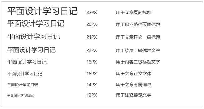 不同字號的預設,主要用以拉開頁面的層級結(jié)構(gòu)。字重有Blod、normal、light三種狀態(tài),在加上色彩的變化,就可以制作出很多種對比變化來,并足夠用來表達頁面內(nèi)容的主次關(guān)系。