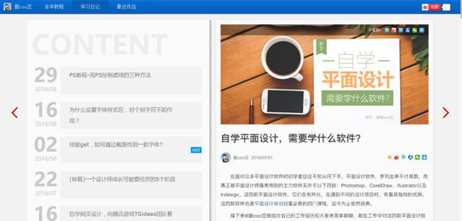 我在準備制作這個網(wǎng)站時,其核心就是以“平面設計自學者的福音”為宗旨,希望解決初學者自學平面設計時需要的資源難題。所以就策劃了職業(yè)路徑、設計教程、設計書籍幾個主要欄目,這是學習平面設計補給知識最為迫切的三個需求。以及學習日記欄目,可以用來寫寫自己的學習心得,滿足自己的同時,幫助他人。