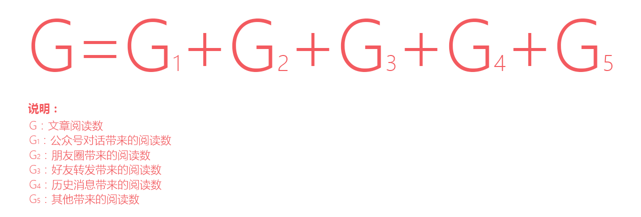通過公眾號后臺的數(shù)據(jù)統(tǒng)計維度進(jìn)行劃分,一篇文章的閱讀數(shù)G=G1+G2+G3+G4+G5。