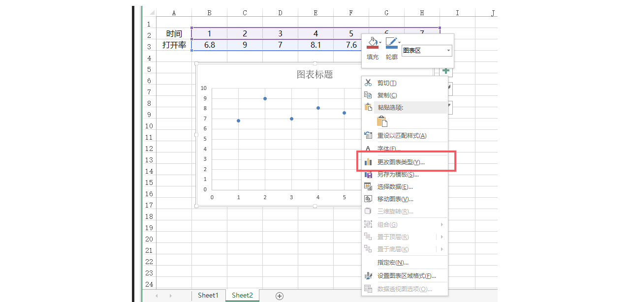 將導(dǎo)入的數(shù)據(jù)隨意生成圖表,在圖表上方點擊右鍵,選擇“更改圖表類型”。