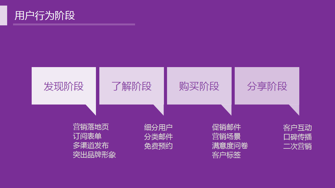 每個階段又可以細分多個核心要點,第一步,發(fā)現(xiàn)階段,需要創(chuàng)建營銷落地頁、插入訂閱表單、多渠道發(fā)布、突出品牌形象。第二步,了解階段,需要細分用戶、分類郵件營銷策略、建立免費線下預(yù)約。第三步,購買階段,制作促銷郵件、策劃不同營銷場景、購買后的滿意度調(diào)查、依據(jù)客戶特點打標簽。最后,分享階段,和客戶互動、鼓勵客戶向自發(fā)傳播、針對客戶屬性進行二次營銷。
