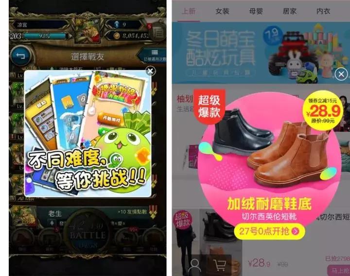 一般在應(yīng)用(游戲、視頻應(yīng)用居多)暫停、過關(guān)、跳轉(zhuǎn)、退出時(shí)以半屏或全屏的形式彈出,展示時(shí)機(jī)巧妙避開用戶對應(yīng)用的正常體驗(yàn),用戶可選擇點(diǎn)擊或忽略。