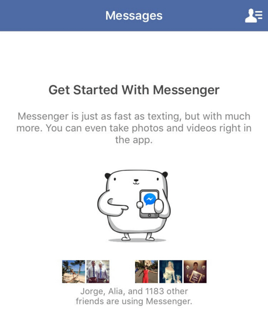 Facebook Messenger的安裝屏幕。當用戶到達此屏幕時,他們會受到鼓勵 – 屏幕讓用戶知道產(chǎn)品的優(yōu)點(用戶可以使用Messenger拍照或錄制視頻),并告訴他們有多少Facebook的朋友已經(jīng)在使用該應(yīng)用程序。“安裝”按鈕引導(dǎo)用戶進行清除空狀態(tài)所需的下一步。用戶根本沒有其他選擇,只需觸摸安裝。