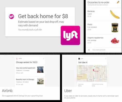 不過這里有一個將服務(wù)推廣和用戶行為結(jié)合的非常好的例子:Google Now最近和Lyft、Airbnb、Uber及Instacart合作,為用戶有針對性地推薦服務(wù)(圖11)。Google認(rèn)為雖然這都是別人家的產(chǎn)品服務(wù),但自己的用戶在使用Google的過程里也會需要這些服務(wù)。因此即使是第三方應(yīng)用,可有被推薦的意義,而且當(dāng)這些應(yīng)用是收費的,也不失為一種機智又不露聲色的廣告形式。