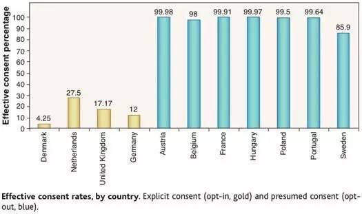 默認(rèn)用戶接受和讓用戶選擇是否接受,有時候會帶來很大的差異。舉個例子來說,對于器官捐獻這件事,當(dāng)人們可以選擇是否捐獻時,他們愿意捐獻的比例往往很低,而當(dāng)器官捐獻作為一個默認(rèn)選項的時候,愿意捐獻的比例則高很多 (圖16)。