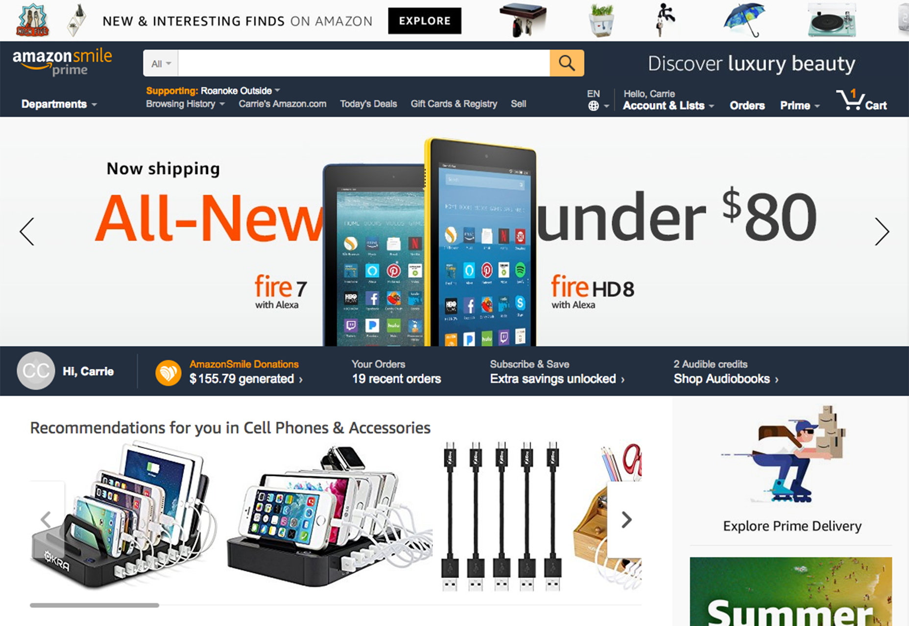 在這個用戶體驗高度個性化的時代,網(wǎng)頁導航的玩法可以更加多樣。以Amazon 為例,當你登錄了之后,會發(fā)現(xiàn)導航開始圍繞著你的信息進行了調(diào)整,導航欄從通用的條目變?yōu)楦N近你的個人情況的樣式,其中包括最近的購買記錄,信用額度和Amazon 的服務(wù)信息等。