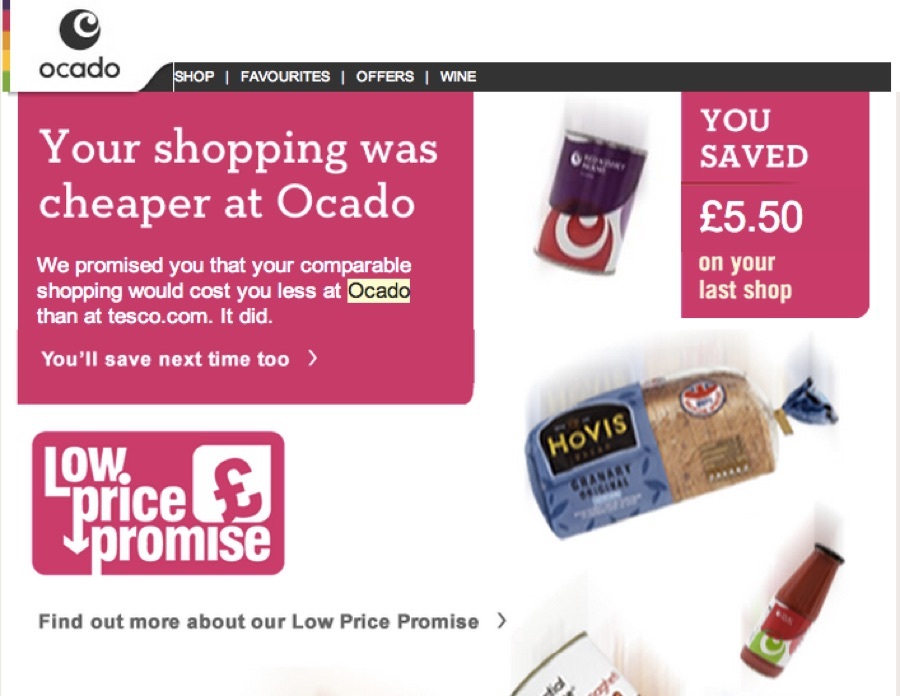 在國外我們經常會看到這種“低價承諾”型的郵件,這種個性化的郵件結合了用戶的歷史消費記錄和購買偏好,對于價格指導型的客戶非常受用。好了,現(xiàn)在讓我們來看看ocado是如何利用此類郵件增加用戶黏性的!