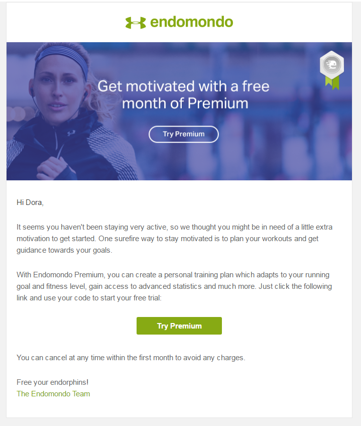 如何做呢?結合品牌的定位與優(yōu)勢,為客戶推送降價通知(電商)、習慣養(yǎng)成計劃(閱讀、運動APP)都是不錯的思路。例如:知名運動APP——endomondo近期針對衰退期用戶發(fā)送的郵件就取得了不錯的營銷效果。