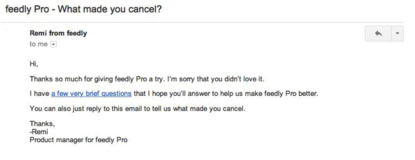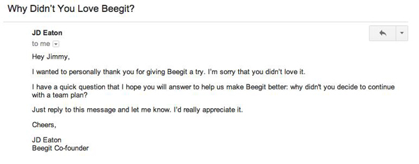 當然在郵件營銷領域,我們把退訂不久的用戶也視為我們需要挽回的對象,給這些用戶發(fā)送一封挽回郵件。以往我們總是發(fā)送太多自動化的電子郵件,失去了與用戶一對一溝通的機會。在挽回郵件中,你可以讓你的語氣更加誠懇一些,看起來就像在溝通對話。