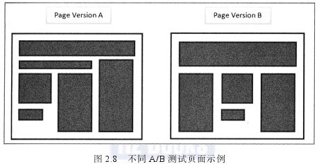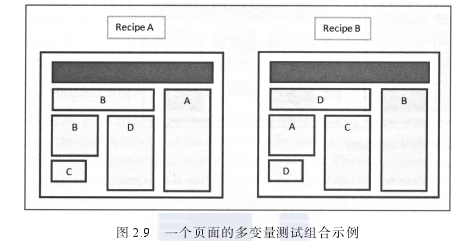 大部分在線營銷人員都從使用這種更簡單的測試形式開始,然后再進(jìn)化到更復(fù)雜的測試類型,如多變量測試(下面將做說明)。圖2.8展示了一個(gè)例子,兩個(gè)不同風(fēng)格的頁面在A/B測試中進(jìn)行比較,它們的模塊布局、橫幅和圖片都不同 。