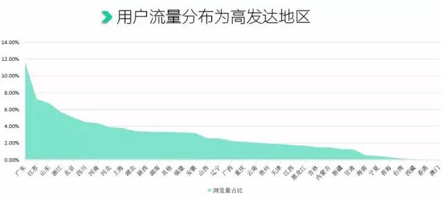 百度文庫用戶流量主要分布在高發(fā)達地區(qū),其排名前十的分別為:廣東、江蘇、山東、浙江、北京、四川、河南、河北、上海、湖北。