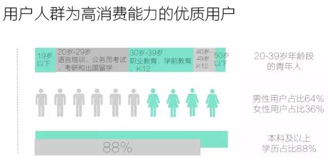 百度文庫用戶人群大部分為高消費能力的優(yōu)質用戶,其中20—39歲年齡段的年青人占了很大比例,本科及以上學歷比例占到88%。