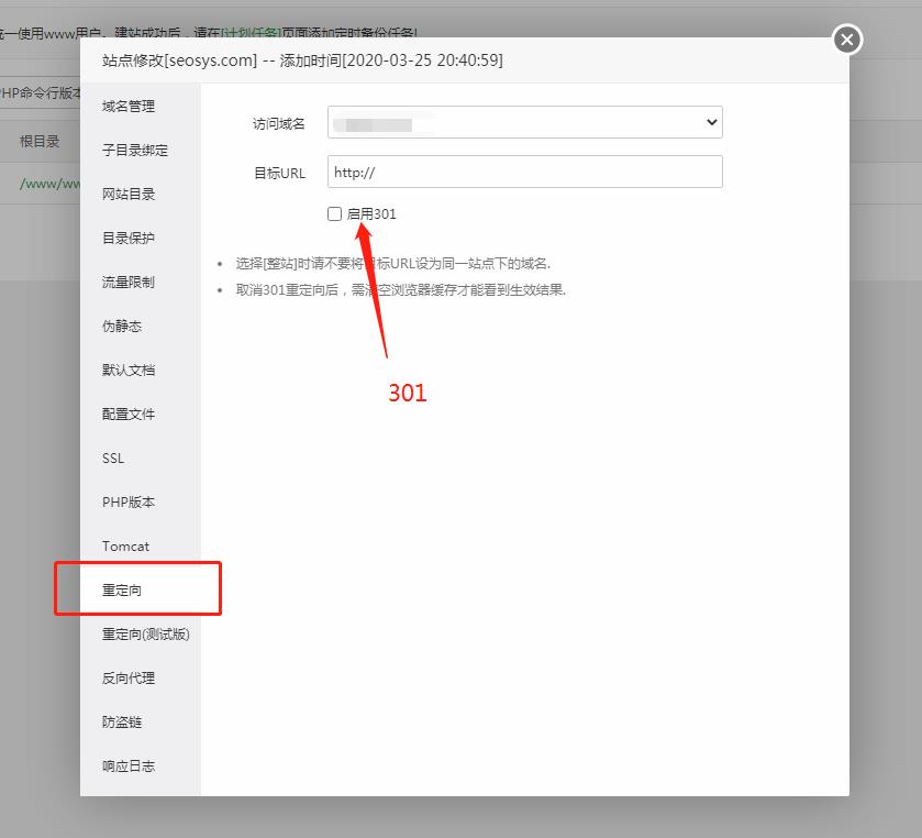 步驟:登錄寶塔——選擇網(wǎng)站——設(shè)置——彈出窗口——重定向——選擇域名——目標(biāo)URL——啟用301——重定向完成