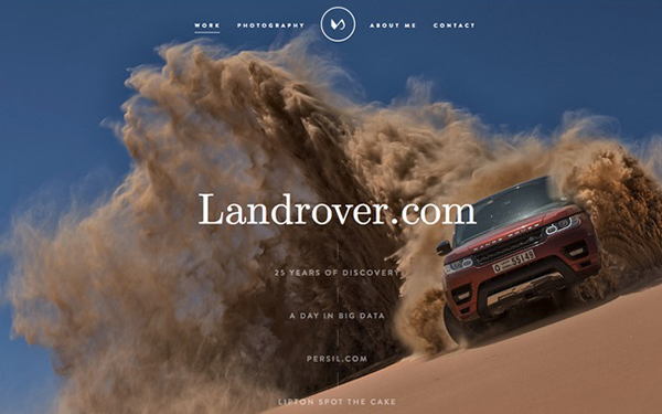 自然,數(shù)字設(shè)計(jì)師和藝術(shù)總監(jiān)維托?塞爾瓦托(Vito Salvatore)的網(wǎng)站應(yīng)該包括引人注目的視覺效果。他選擇的主頁(yè)展示了他的能力。從顏色上看,沙子的顏色與天空的深藍(lán)形成了對(duì)比,這使得這是一個(gè)視覺上的動(dòng)態(tài)圖像。對(duì)于功能來(lái)說(shuō),選擇白色的排版允許鏈接突出地突出,盡管背景攝影的宏偉。在更微妙的層次上,棕褐色的顏色實(shí)際上是藍(lán)色天空的補(bǔ)充,就像你在這個(gè)色輪里看到的那樣。雖然這在照片中可能是純粹的巧合,但它在美學(xué)上創(chuàng)造了一種平衡的感覺。還要注意的是,棕褐色的塵埃軌跡會(huì)產(chǎn)生一種行動(dòng)感,讓你的眼睛朝向紅色的汽車(然后指向白色文本菜單的方向)。當(dāng)我們解構(gòu)設(shè)計(jì)時(shí),你可以真正開始看到顏色、視覺和排版如何引導(dǎo)你的眼睛朝向屏幕最有價(jià)值的部分。