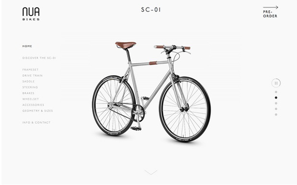 Nua自行車很好地利用了負(fù)空間。憑借其簡(jiǎn)約的風(fēng)格和缺乏相互沖突的視覺效果,該網(wǎng)站將用戶的注意力集中在重要的東西上自行車的銷售。為了更多地了解負(fù)空間的力量,我們強(qiáng)烈推薦設(shè)計(jì)師馬克?博爾頓的一篇文章。他更詳細(xì)地探索了負(fù)空間,解構(gòu)了它的主動(dòng)和被動(dòng)元素,以及將負(fù)空間歸類為微觀或宏觀的空白。