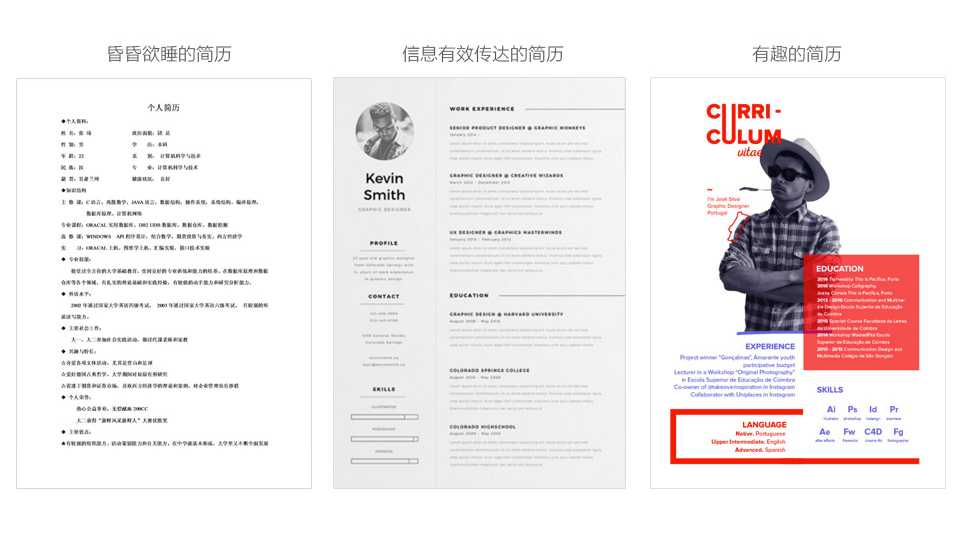 組織頁面信息的首要任務(wù)是判斷信息優(yōu)先級,分清重要信息與次要信息,刪除無用信息。化繁為簡,降低視覺干擾。舉個小例子,從一份簡歷,就可對一名應(yīng)聘UI設(shè)計師的平面設(shè)計基礎(chǔ)能力略知一二。首先對無用信息的判斷(講真,曾看到簡歷中還有體重信息)。其次是關(guān)鍵信息的組織排列、清晰表達。個人信息:姓名、年齡、照片、聯(lián)系方式;基本信息:工作經(jīng)歷、教育背景、職業(yè)技能;其他信息:興趣愛好等。數(shù)份簡歷扎堆時,信息有效快速傳達是第一步,再者才是加入一點點自己的小個性。