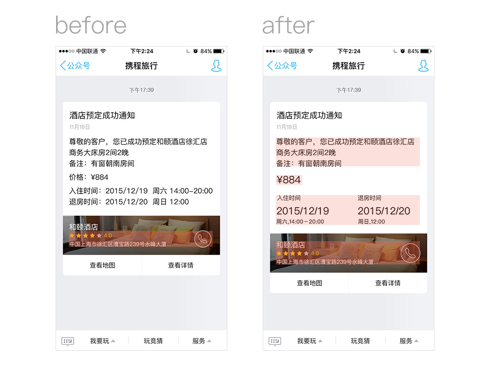 先從一個酒店預定成功通知消息案例來看,通知信息文字平鋪直敘,并未合理分組(左圖)。圖片部分上方酒店評價、信息地址和電話操作按鈕劇中對齊,酒店名成為了一個小標題。做適當調(diào)整后(右圖),使得正文通知、價格和時間字段分組明確。電話按鈕同酒店信息組對齊,使得圖片區(qū)域的文字和操作信息更為整體。