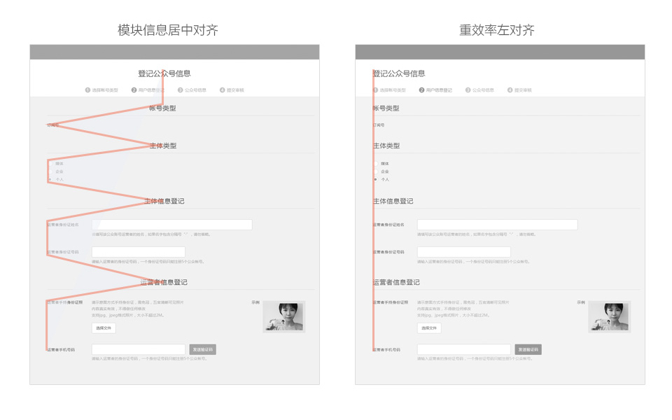 信息分組后,居中排列每組信息的小標題,模塊感增強,使得閱讀標題和每個組信息中產(chǎn)生視線的跳躍。小標題和每組信息統(tǒng)一居左對齊,更符合快速瀏覽和操作。比如在需要完成注冊任務(wù)的網(wǎng)頁中,標題居左更有利于視線快速向下流動,使得操作路徑更順暢。