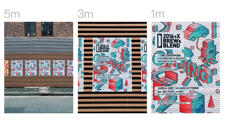 前面談了如何組織信息,那如何使主要信息更為有重點?首先可以通過拉開大小比例,拿一張活動海報來舉例。5米處能看到什么?海報的大圖案渲染氣氛的整體感受;3米處能看到什么?活動主標題;1米近距離又能發(fā)現(xiàn)什么?具體信息和時間等。拉開主次信息的尺寸大小對比,從空間距離上,使得觀眾接受信息傳達有了先后。觀眾近距離閱讀,信息有效傳達的順序同理適用。