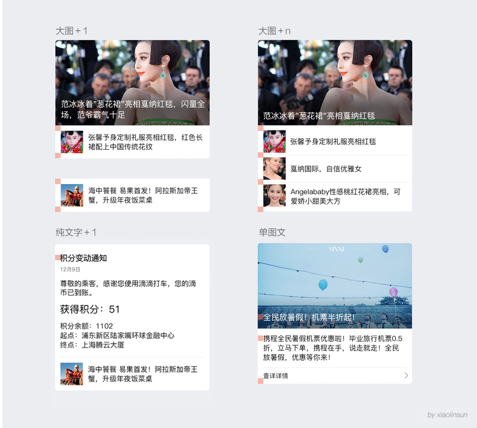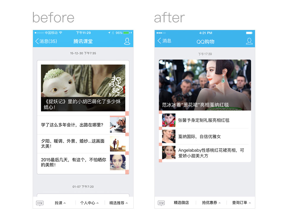 在手Q公眾號圖文消息優(yōu)化中,我們發(fā)現(xiàn)線上舊的圖文消息邊距較為肥厚,在大圖+1小圖的情況下由于代碼的模塊化拼接,始終無法達到好的像素間距。在考慮多種純文字、單圖、多圖文模版拼接后,盡量減少間距規(guī)則和字號種類,達到拼接模版的統(tǒng)一規(guī)則。保證一致性為前提,也提供靈活拼接的多樣性。