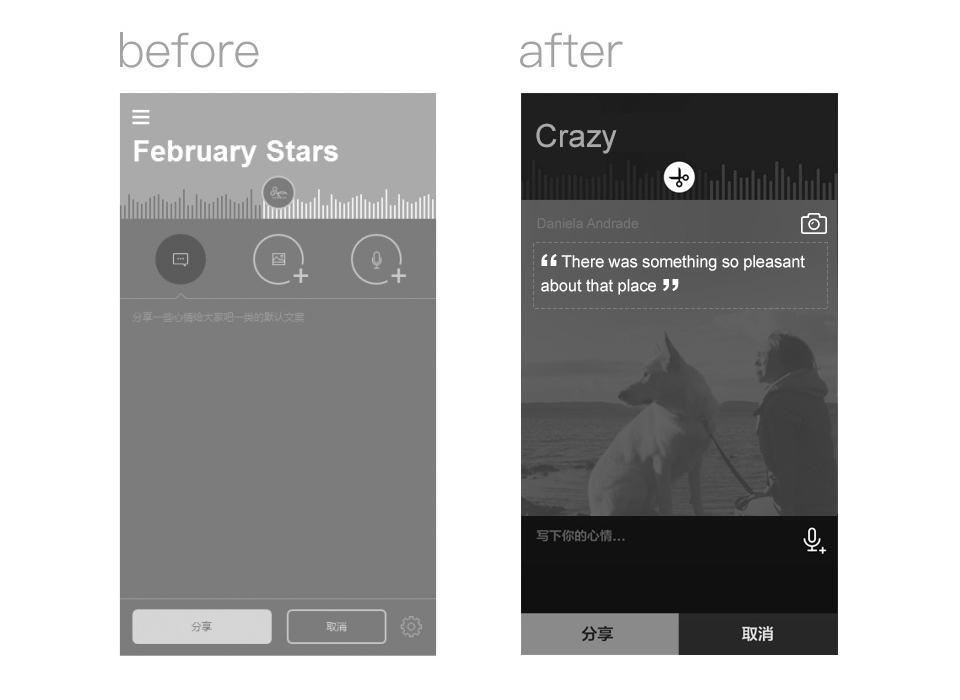在某電臺app概念設(shè)計中,分享功能支持獲取歌詞并同時拉取專輯封面配圖,允許用戶上傳照片、寫下當時的心情或是用語音表達。最初設(shè)計時的界面交互框架(左圖)默認功能在“寫下心情”,“加圖片”和“錄語音”的功能重要性并列,感受上是個功能強大的分享界面,告訴用戶你有三種選擇配心情內(nèi)容的方式。討論后優(yōu)化框架(右圖),默認拉取專輯封面圖,支持上傳圖片入口置于右上角,默認歌詞展示在封面圖上可點擊編輯,整個頁面可視化了最終分享出去的樣式,所見即所得。設(shè)計優(yōu)化后,讓整個操作有了重點。可以直接在分享預覽圖上操作,縮短了分享路徑,最重要帶給用戶輕量化的操作感受。
