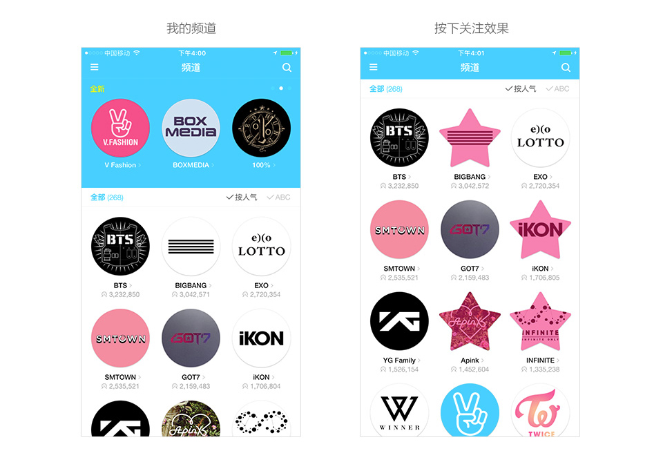 關(guān)注一個賬號、小站的通常app的做法是:頭像加關(guān)注按鈕。在 V 的頻道界面中,點擊頭像即關(guān)注,按下后頭像成為星形遮罩,表示已關(guān)注,點擊操作反饋超乎預期又在情理之中。