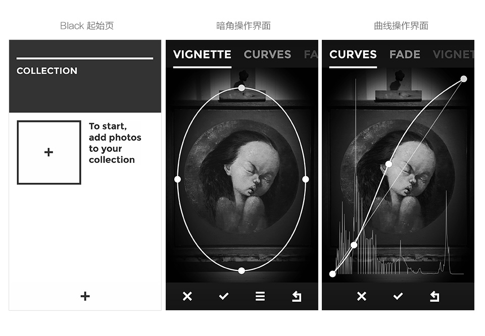 在手機app上后期處理一張照片時,通常是操作區(qū)域和照片分開。Black 的處理照片主界面的操作有趣而直觀,再調(diào)整曲線或加暗角操作都在圖片層上,整個界面的導航也突破了傳統(tǒng)控件模塊,使得整個app在直觀又易操作的基礎(chǔ)上,彰顯獨特的態(tài)度和個性。
