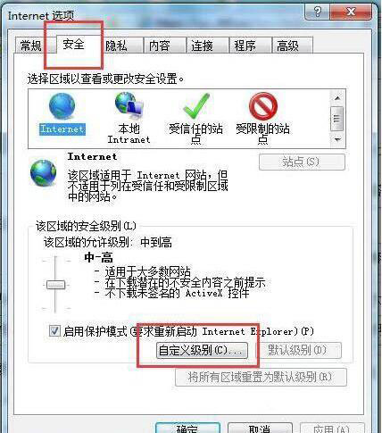 2、點(diǎn)擊“安全”進(jìn)入“Internet”點(diǎn)擊“自定義級(jí)別”。如圖所示: