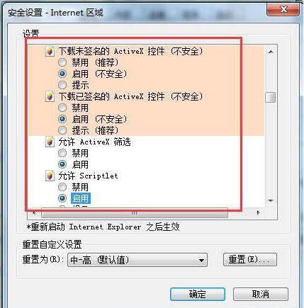 3、在“對(duì)標(biāo)記為可安全執(zhí)行腳本的ActiveX控件執(zhí)行腳本”后點(diǎn)擊“啟動(dòng)”,在“對(duì)未標(biāo)記為可安全執(zhí)行腳本的ActiveX控制初始化并執(zhí)行腳本(不安全)”。如圖所示: