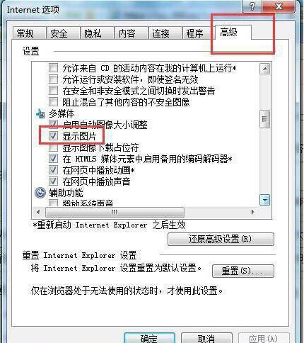 6、在Internet選項(xiàng)中點(diǎn)擊“高級(jí)”勾選“顯示圖片”后確定。如圖所示: