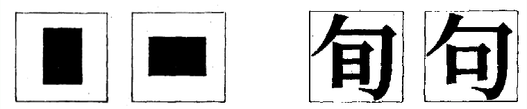 上圖上1為正方形,2是1旋轉(zhuǎn)45度后形成的菱形,但是在視覺上看起來卻比1更大。3是與1等高的菱形,它的面積變小了。4與1相同,5是大小感覺上與4相等的菱形,但實際上5比4小一點。下一排的漢字也是依照這樣的理論得到的。我們在設(shè)計時應(yīng)注意字體外形的差異帶來的錯覺,追求整體視覺的統(tǒng)一而非物理統(tǒng)一。