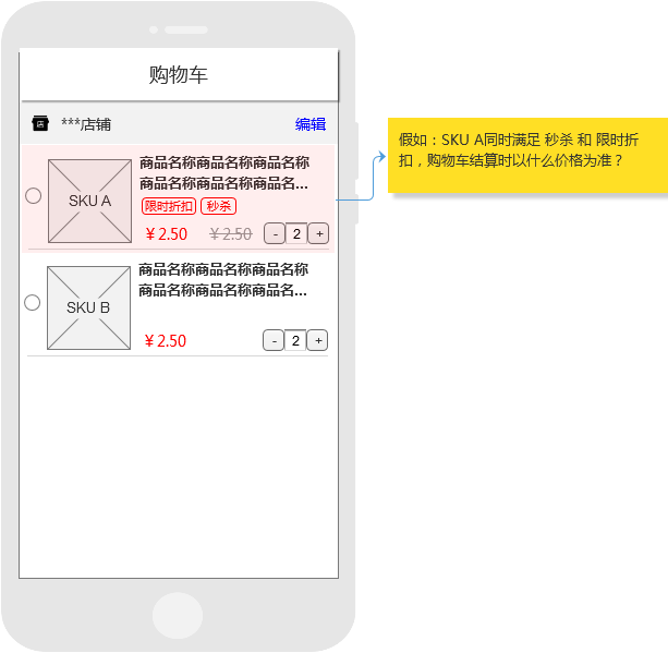 因?yàn)橥粋€(gè)SKU 在同一段時(shí)間內(nèi)具備了兩個(gè)價(jià)格(一個(gè)秒殺價(jià)格,一個(gè)折扣價(jià)格),這時(shí)候系統(tǒng)該選擇哪個(gè)價(jià)格作為這個(gè)SKU的價(jià)格呢?如果一個(gè)用戶(hù)恰好添加了這個(gè)SKU 到購(gòu)物車(chē),那么購(gòu)物車(chē)的促銷(xiāo)怎么展示?畫(huà)風(fēng)是這樣的,大家感受一下: