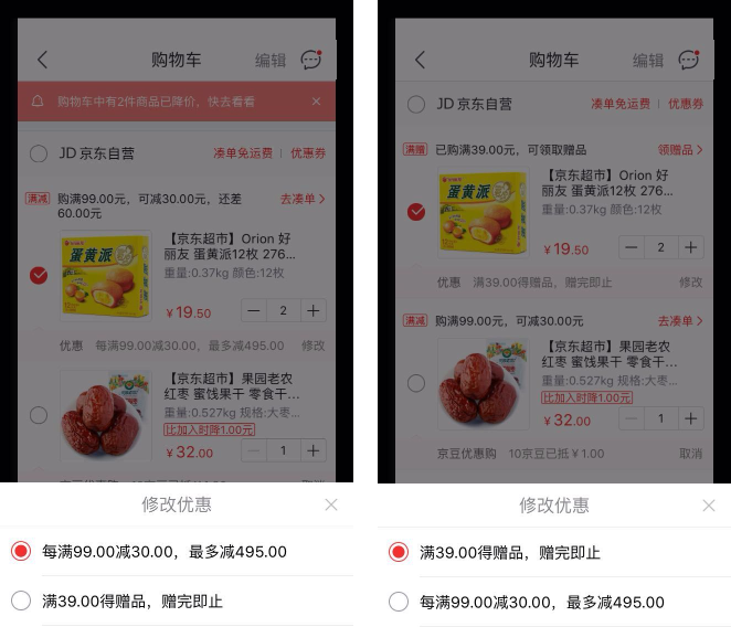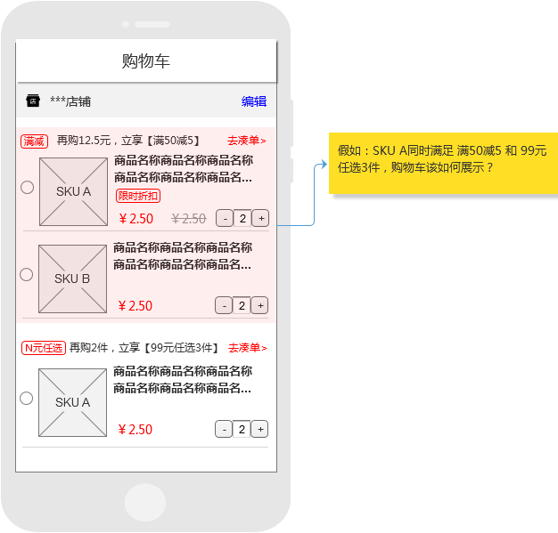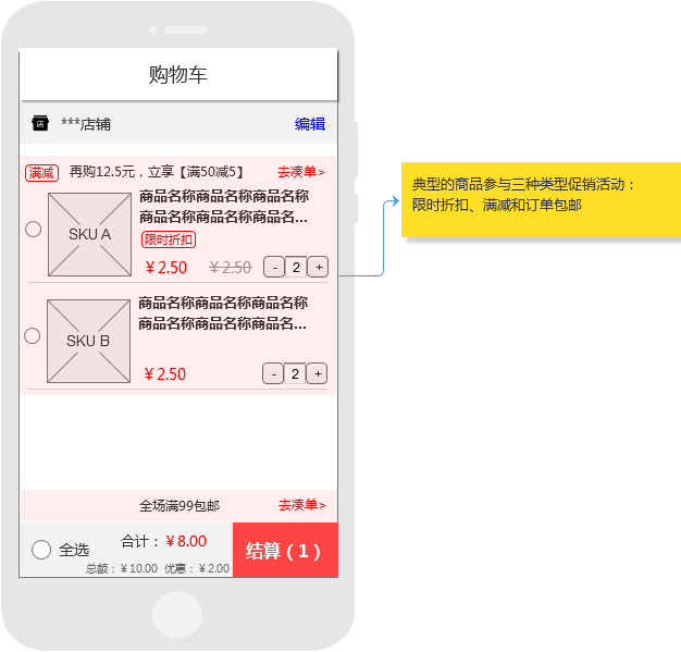 再者,購(gòu)物車(chē)還需要承擔(dān)提示用戶(hù)湊單的重任,也就是說(shuō):需要一個(gè)確定的促銷(xiāo)活動(dòng)將滿(mǎn)足這個(gè)活動(dòng)的所有商品歸類(lèi)到一組提示用戶(hù)進(jìn)行湊單,如果一個(gè)商品滿(mǎn)足多個(gè)促銷(xiāo)活動(dòng)可以任意切換,切換之后又需要對(duì)切換后的活動(dòng)商品進(jìn)行重新組合并再次計(jì)算滿(mǎn)足的促銷(xiāo)條件及湊單金額,這對(duì)于系統(tǒng)計(jì)算工作量來(lái)講…而且對(duì)于用戶(hù)而言,他們真的不會(huì)被購(gòu)物車(chē)同一商品多個(gè)促銷(xiāo)活動(dòng)搞懵逼了嗎?