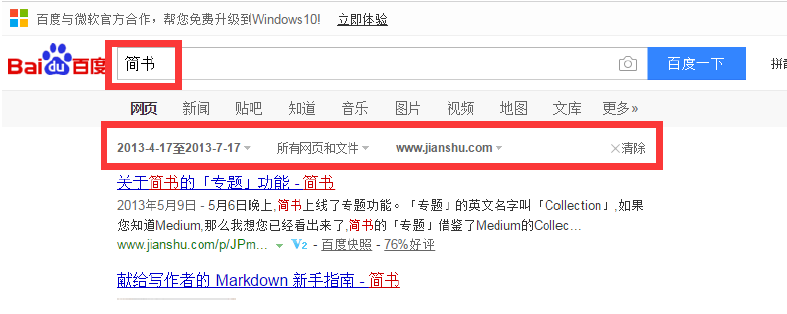 打開百度搜索引擎,如果我要找到簡書上在某一時間階段的所有文章(比如2013年4月13日至2013年7月13日),那么我可以進(jìn)行如下操作:
