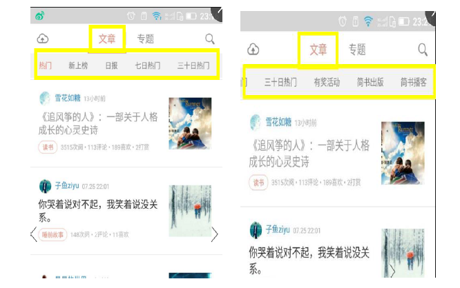 文章時用戶寫的單獨(dú)的一篇文章,每篇文章左側(cè)三分之二顯示文章的題目、作者、發(fā)布時間、閱讀次數(shù)、評論次數(shù)、喜歡數(shù)、專題來源、打賞數(shù),右側(cè)的三分之一為文章的第一個配圖。