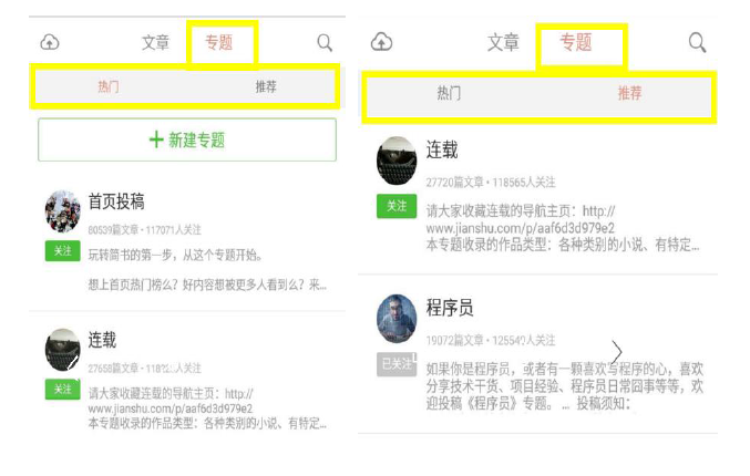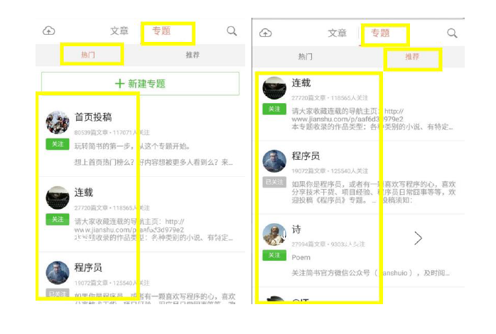 在專題板塊下,有熱門和推薦兩個子版塊。頁面有設(shè)有不同的專題頁面。專題是簡書的一個功能,每個用戶進(jìn)入某個專題閱讀該專題下的文章,也可創(chuàng)建一個專題,同時,如果用戶可以對自己感興趣的專題進(jìn)行關(guān)注,并在關(guān)注的同時,可以選擇是否接收關(guān)注專題的更新文章的推送。