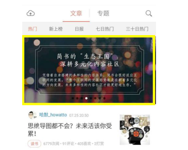 其中,“熱門”是簡書的默認(rèn)首頁,當(dāng)你打開簡書app時,直接呈現(xiàn)給用戶的就是熱門,熱門板塊下有兩部分組成:首頁和熱門文章。