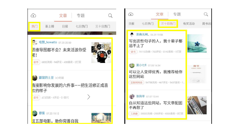 其實(shí)簡書上的內(nèi)容控制主要還是依靠機(jī)器算法。依靠機(jī)器算法實(shí)現(xiàn)控制的內(nèi)容有文章板塊下的熱門(包括七日熱門、三十日熱門、新上榜)與專題(熱門與推薦)。接下來依次進(jìn)行分析。
