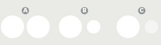 在上圖 A 中,兩個(gè)圓同樣大小,顏色也一樣,所以不能產(chǎn)生層次;而 B 中,將其中一個(gè)圓縮小,就可以使版面形成遠(yuǎn)近的層次; C 中,我們?cè)俳档湍莻€(gè)小圓的不透明度,則會(huì)進(jìn)一步加深層次對(duì)比。