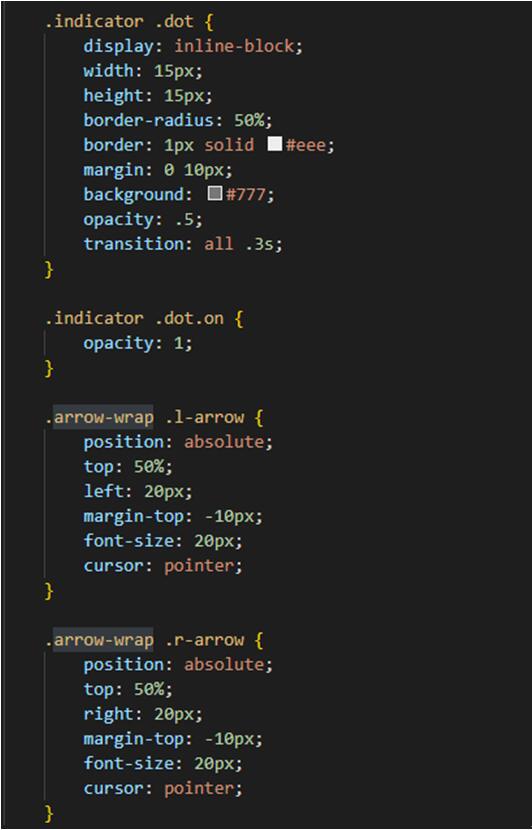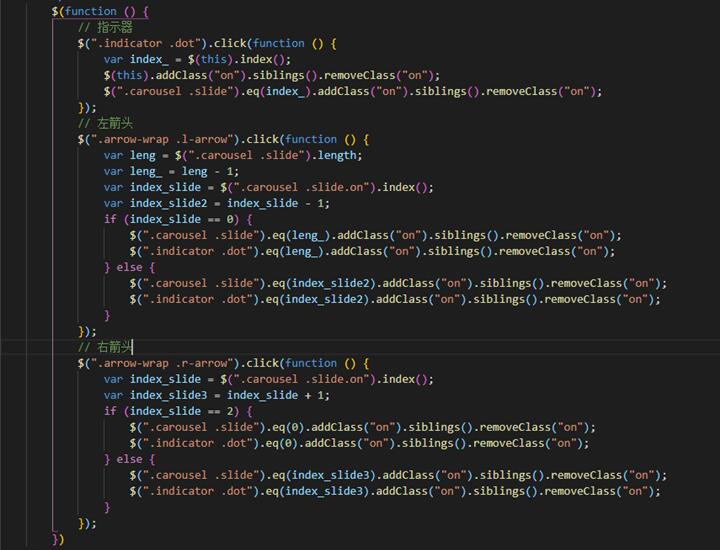 首先如上圖指示器部分的JS,結(jié)合html的元素slide(存放圖片或其他)第一個默認(rèn)有個類名on,當(dāng)點擊指示器任意一個時js獲取點擊當(dāng)前指示器的下標(biāo),同時賦予相對應(yīng)元素slide類名on,結(jié)合css有on類名的顯示,沒有on類名隱藏,從而指示器控制了圖片的隱藏顯示;左右箭頭控制圖片的上一張或下一張顯示隱藏,以左箭頭為例,同理指示器點擊時添加刪除類名on,不過多了一步下標(biāo)的加減還有判斷,有不懂的可以看看上圖。