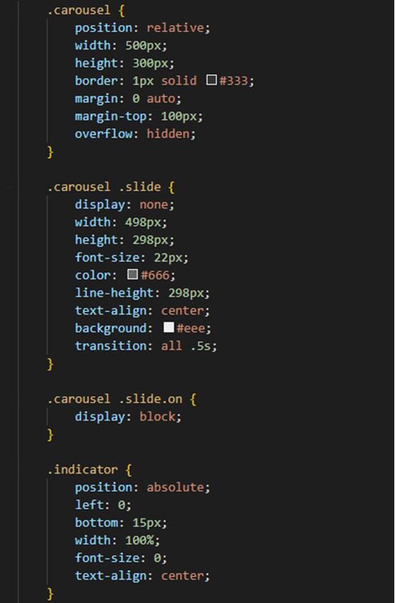 包裹整個輪播圖的div容器carousel寬度可以自行設(shè)置,這里設(shè)置的是500px,高度300px,溢出隱藏(overflow: hidden),這里注意carousel要絕對定位,輪播圖的指示器indicator要相對定位,以便于懸浮在輪播圖上面以及可以點擊到指示器;左右箭頭同指示器同理。